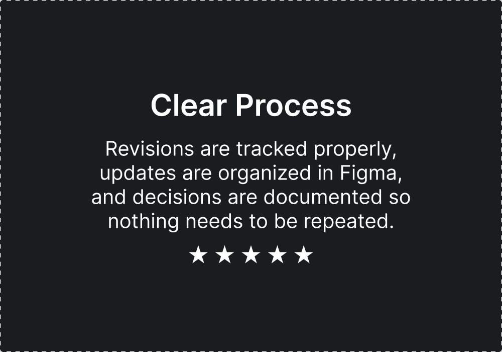 Revisions are handled systematically. Each change is tracked and resolved with clear updates inside Figma. Key decisions are documented so nothing gets repeated or lost. The goal is steady progress, not circular feedback loops.